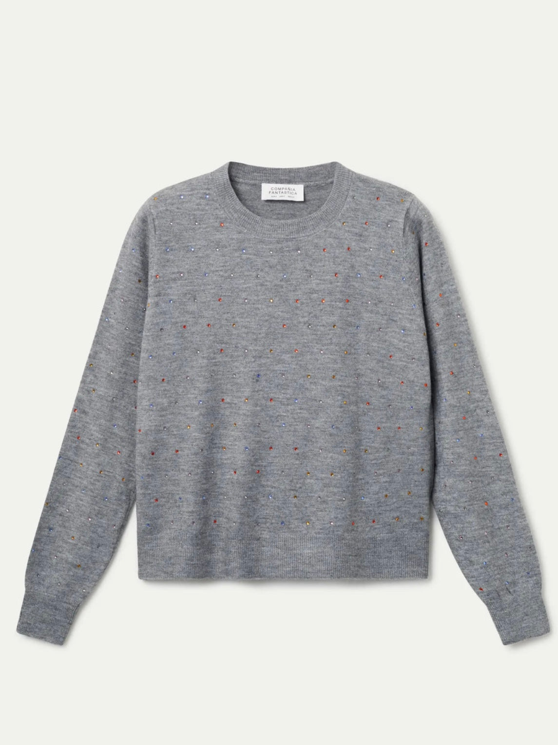 Fine knit grey jumper with multicoloured stones. Ribbed neckline, cuff and hem.