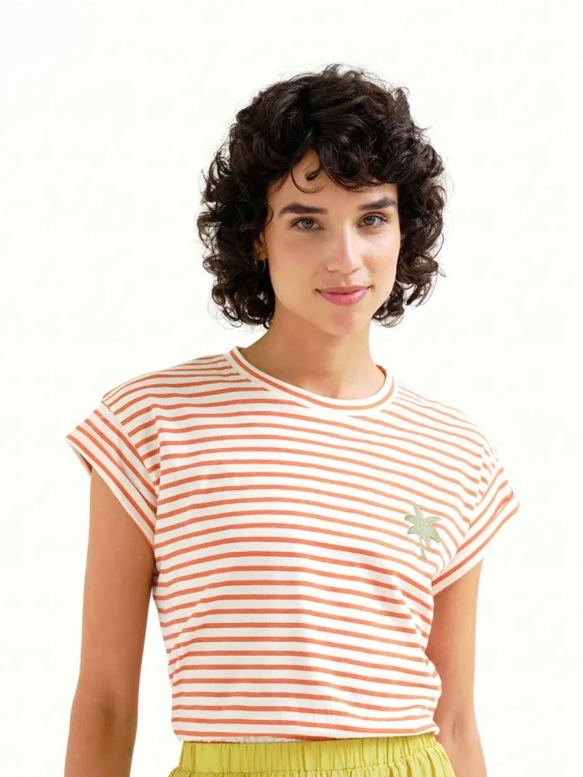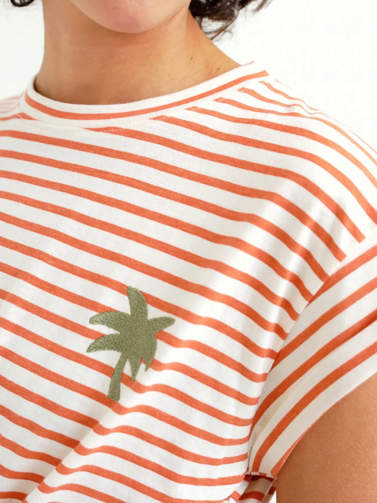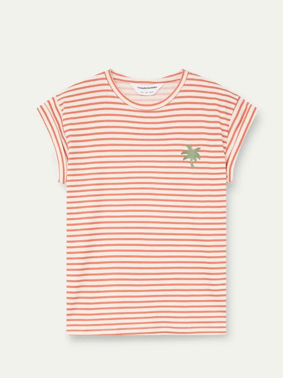 100% cotton fabric t-shirt with red and white stripe print. Round neck and short sleeves. Palm tree embroidered detail. The model is 175 cm tall and wears size S
