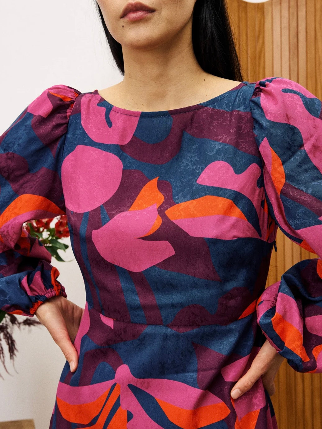 Bright print dress with voluminous sleeves. Scoop back with tie. Front side slit.