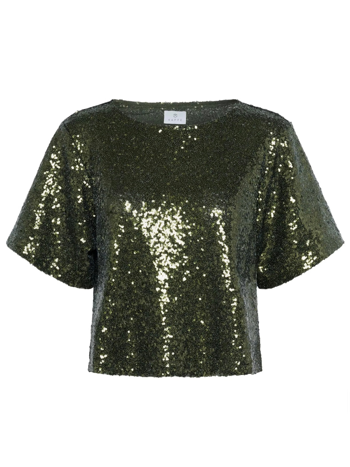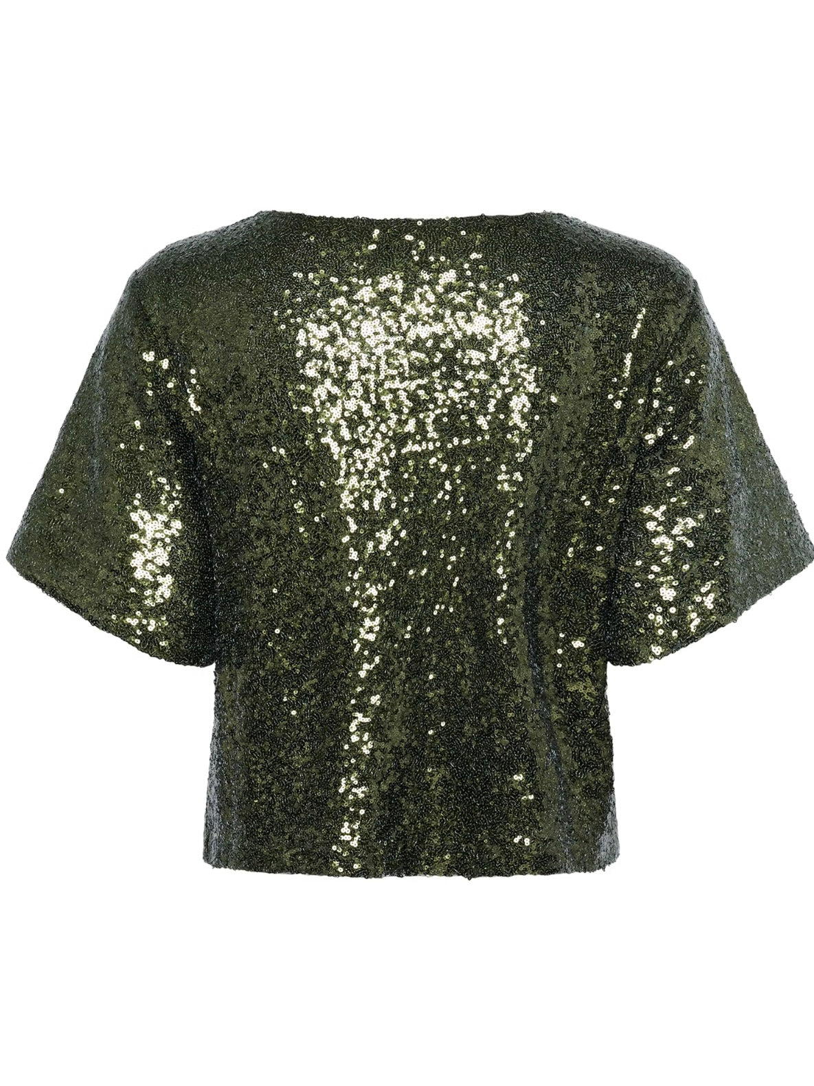 Ivy Green Sequin top with boxy silhouette and short sleeves. Features a crew neckline and cropped length, fully covered in shimmering sequins for an eye-catching effect.