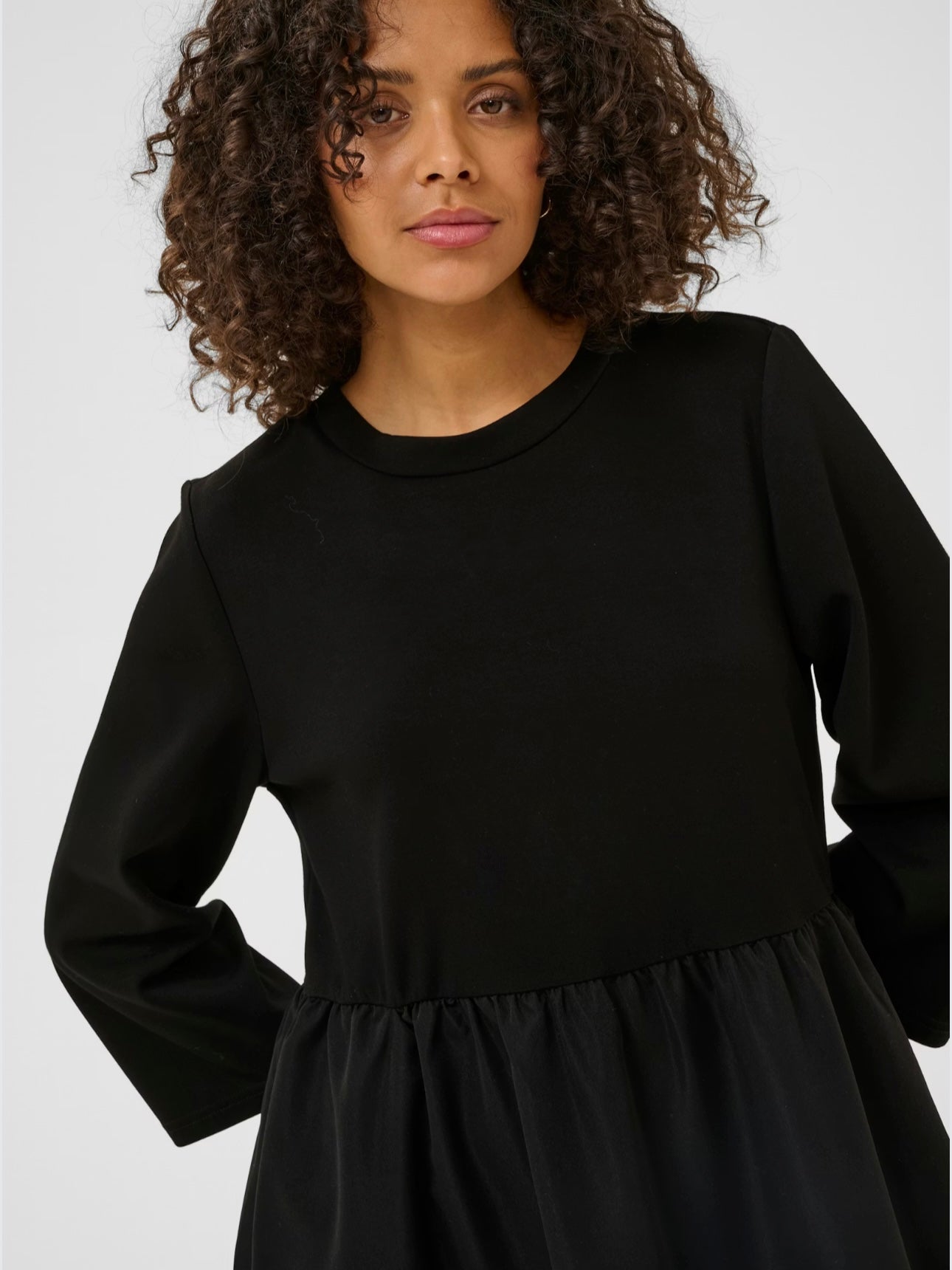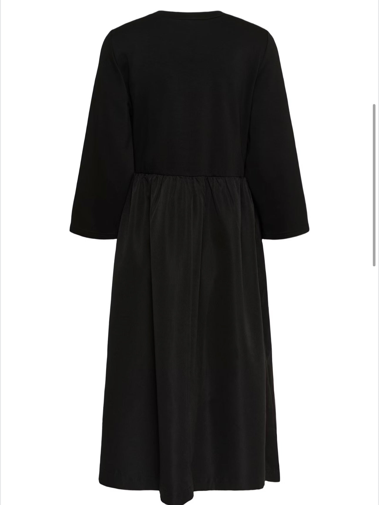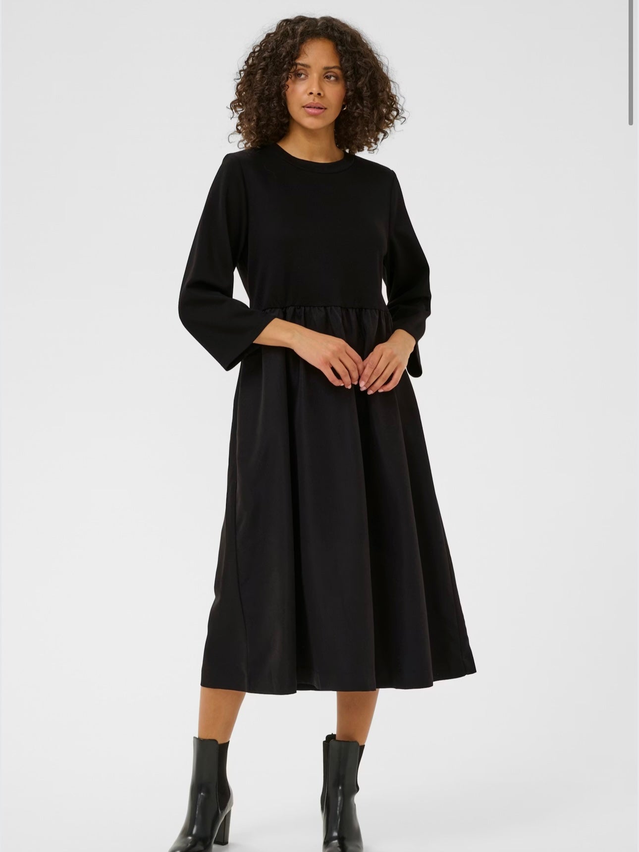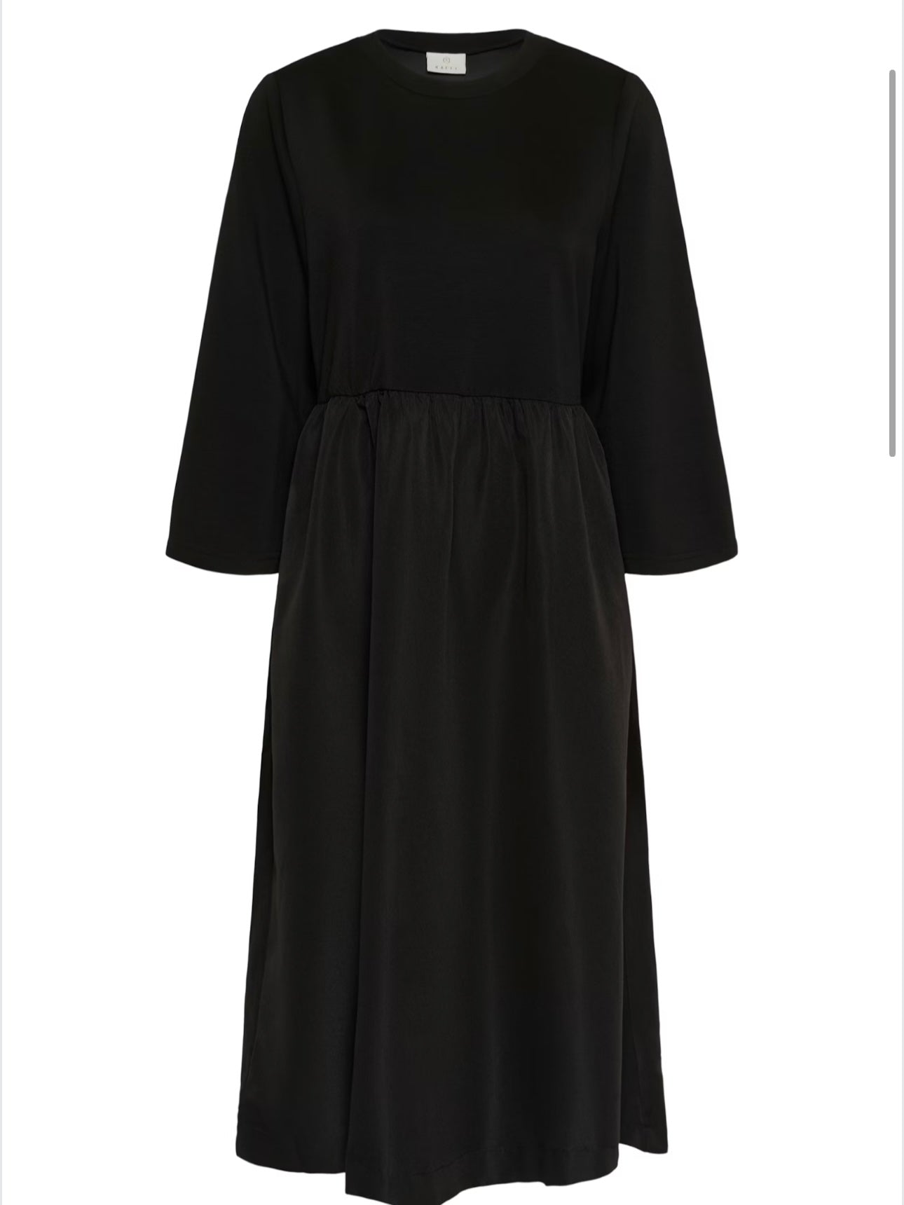 The Rosa midi dress features a softly gathered waist, round neckline, and relaxed three-quarter sleeves for a modern touch.