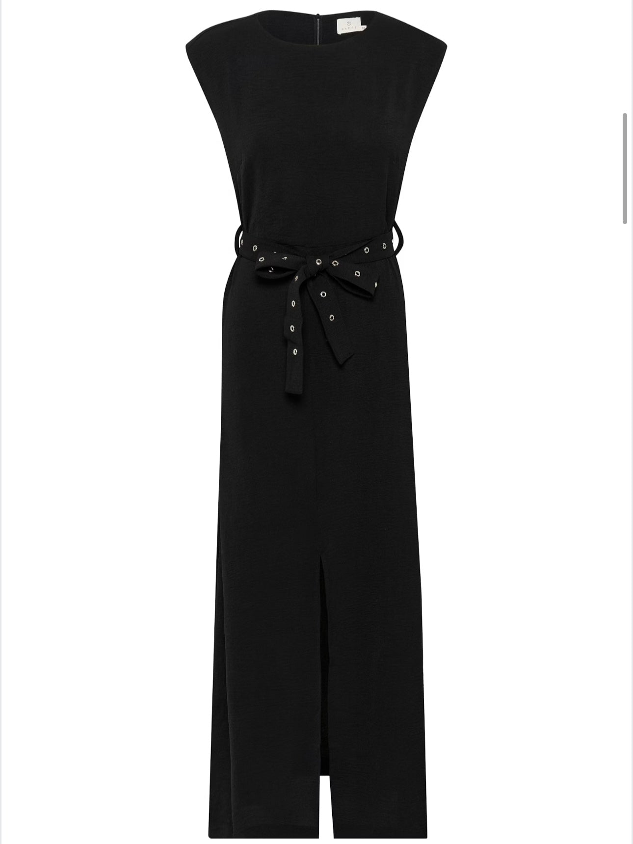 Sleeveless maxi dress with a wide, structured shoulder, straight silhouette, round neckline, and a matching belt with metal eyelets. Features a front slit for ease and effortless style. Minimalist look with subtle texture throughout.