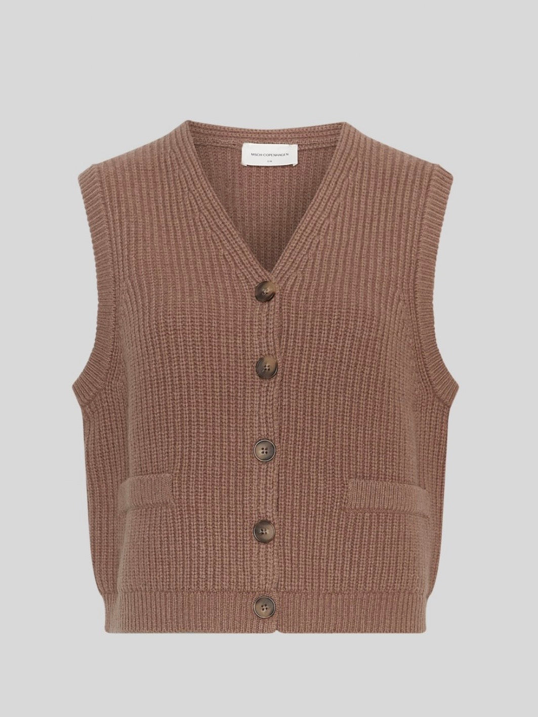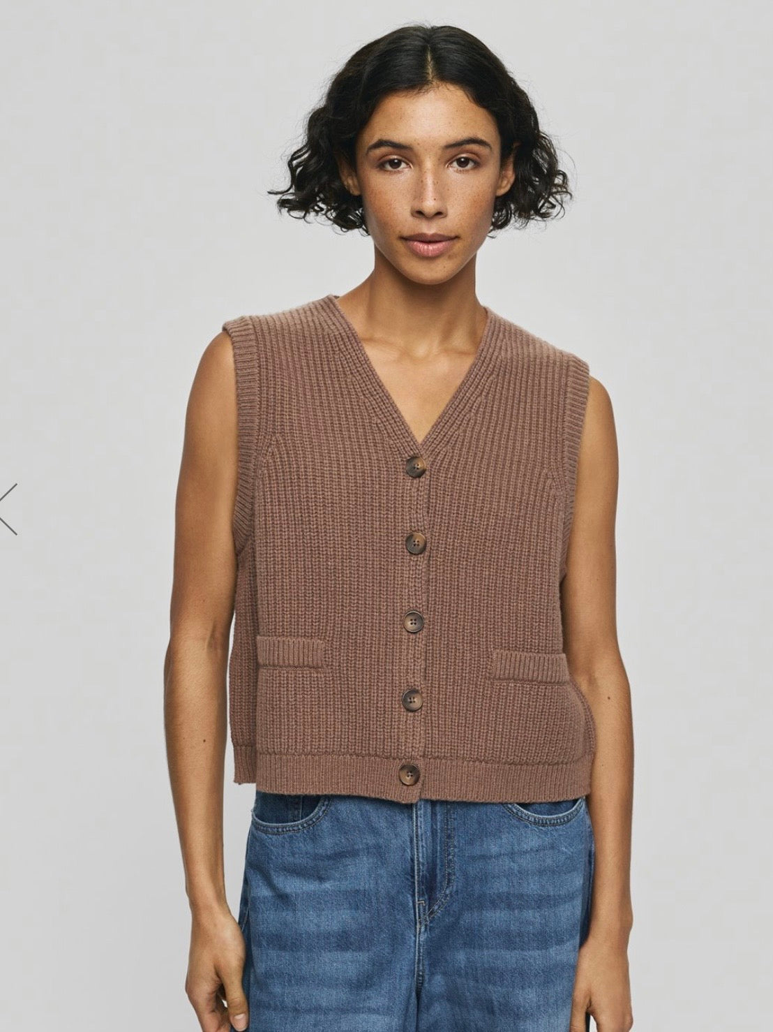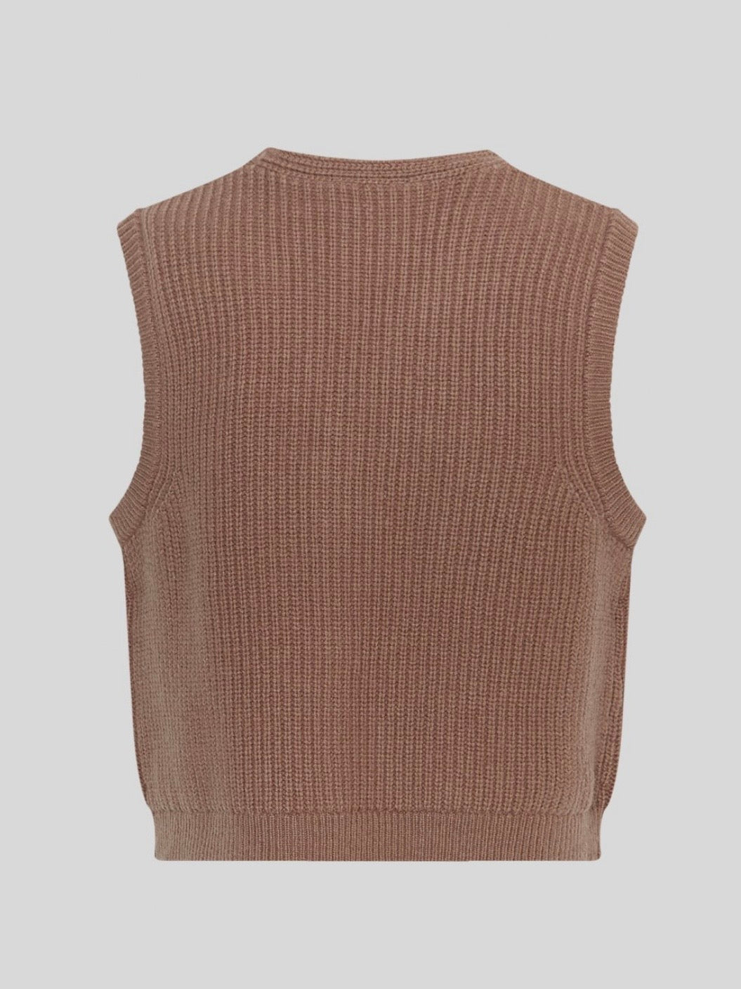 This knitted vest features a classic and timeless design with a V-neckline, button closure at the front and subtle pockets. The textured quality adds a refined look, making it ideal for layering over shirts, dresses or blouses.