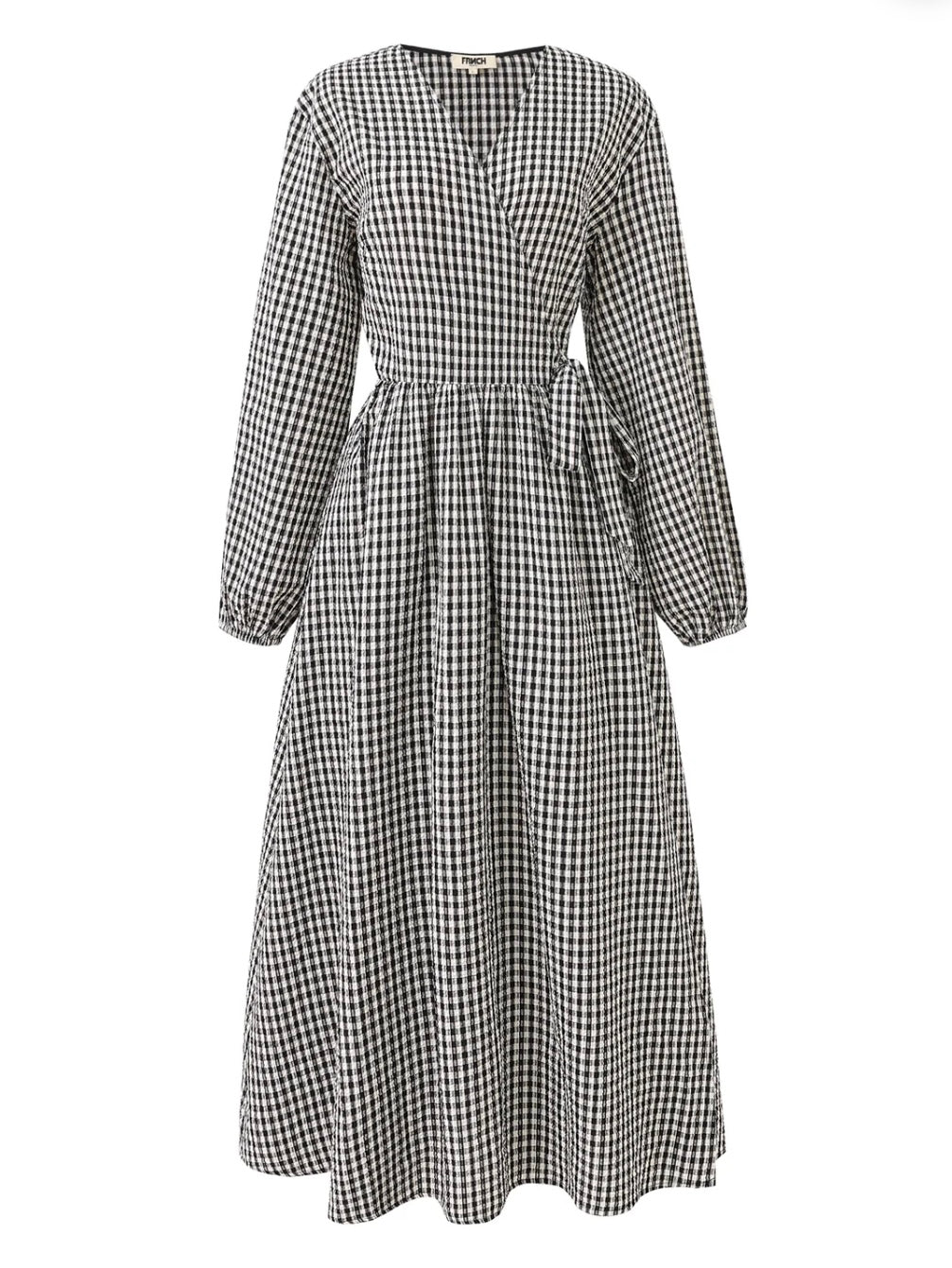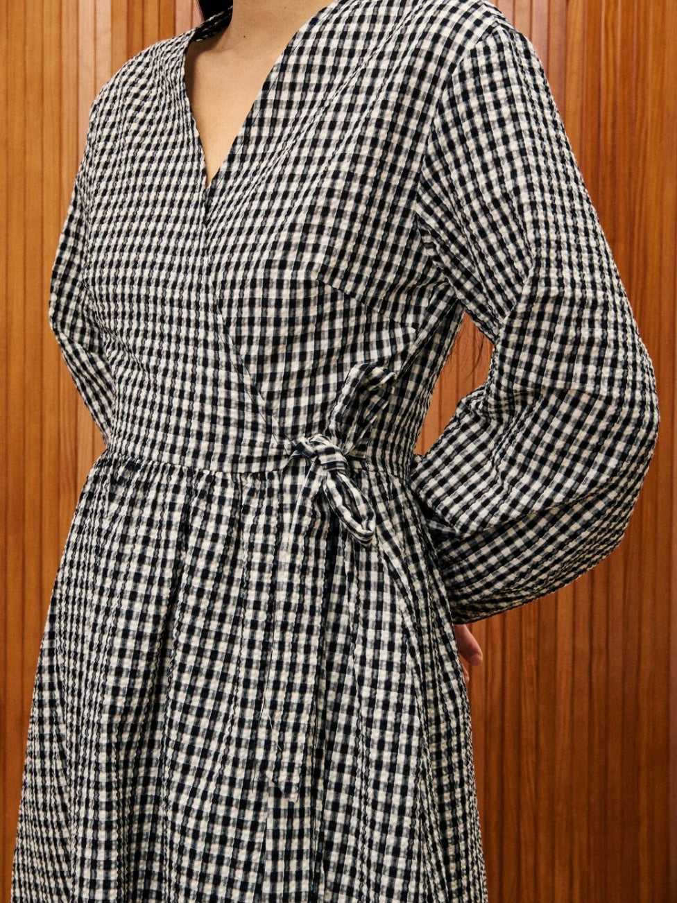Black and white gingham wrap dress. Closes with ties. Long balloon sleeves and side pockets.