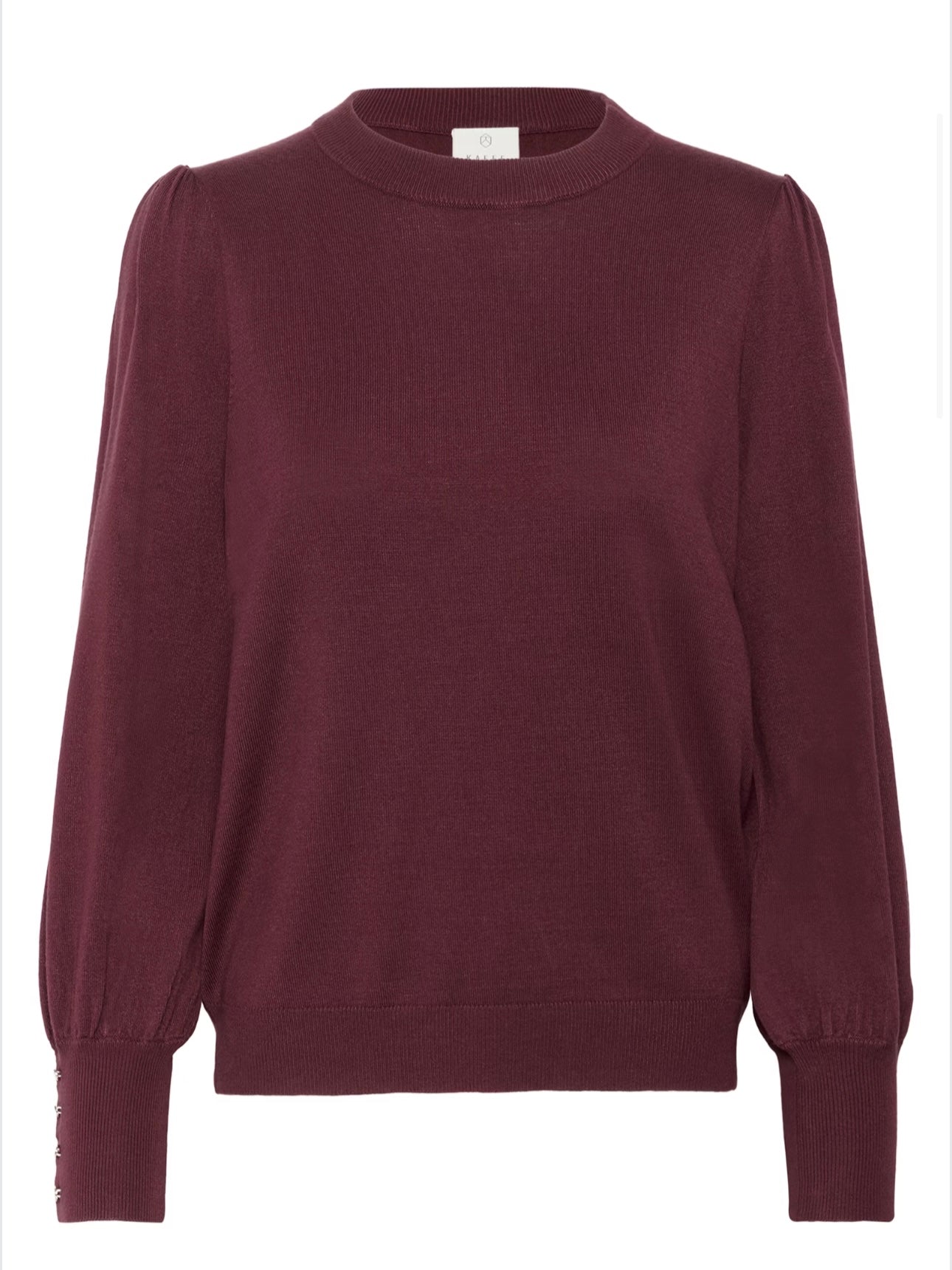 Lizza round neck jumper in black and bordeuax with a deep, puff cuff with buttons.