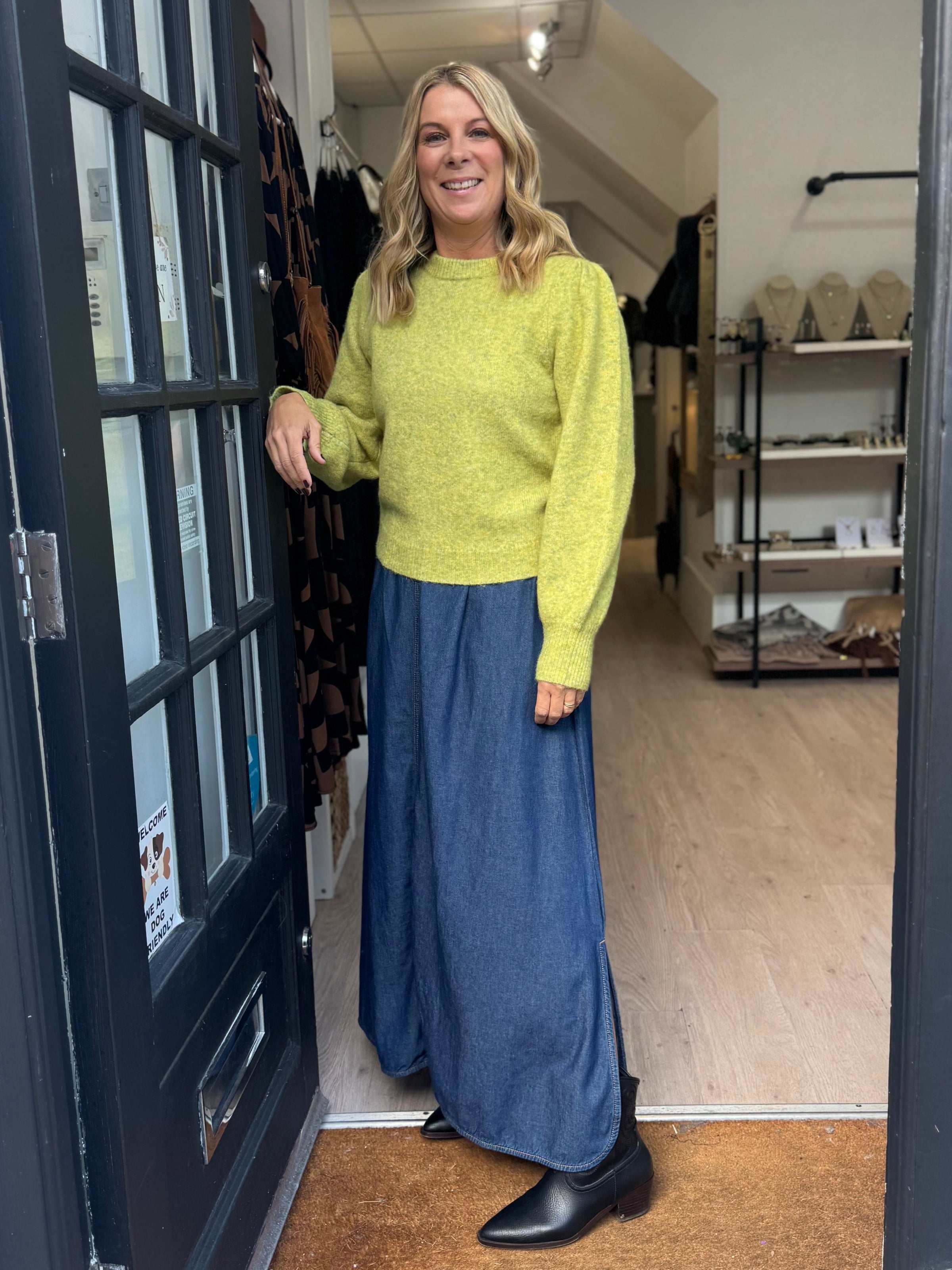 Denim maxi skirt featuring a comfortable elasticated waistband and side splits.The soft finish offers a relaxed, effortless look, enhanced by clean visible stitching along the seams. Generous fit, can size down.